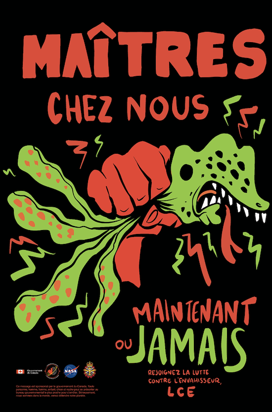 Fake advertising poster for an alien invasion, based off the infamous “Maîtres chez nous” ad from the hydroelectricity movement.